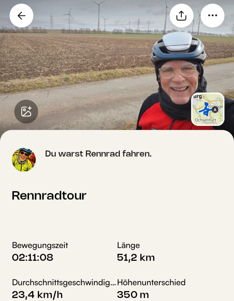 Heute einen tollen Satz bei Audax-Franconia gelesen: Wintertraining ist mehr als nur Kilometer sammeln. Es ist eine Schule für Disziplin, Anpassungsfähigkeit und Demut vor der Natur. Der Winter zeigt einem die eigenen Grenzen auf. Aber jede Minute, die man im Sattel durchhält, macht stärker – für den Frühling und für die kommenden Herausforderungen.