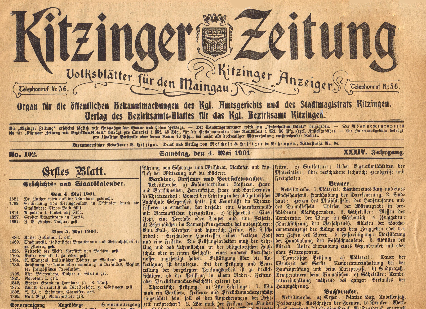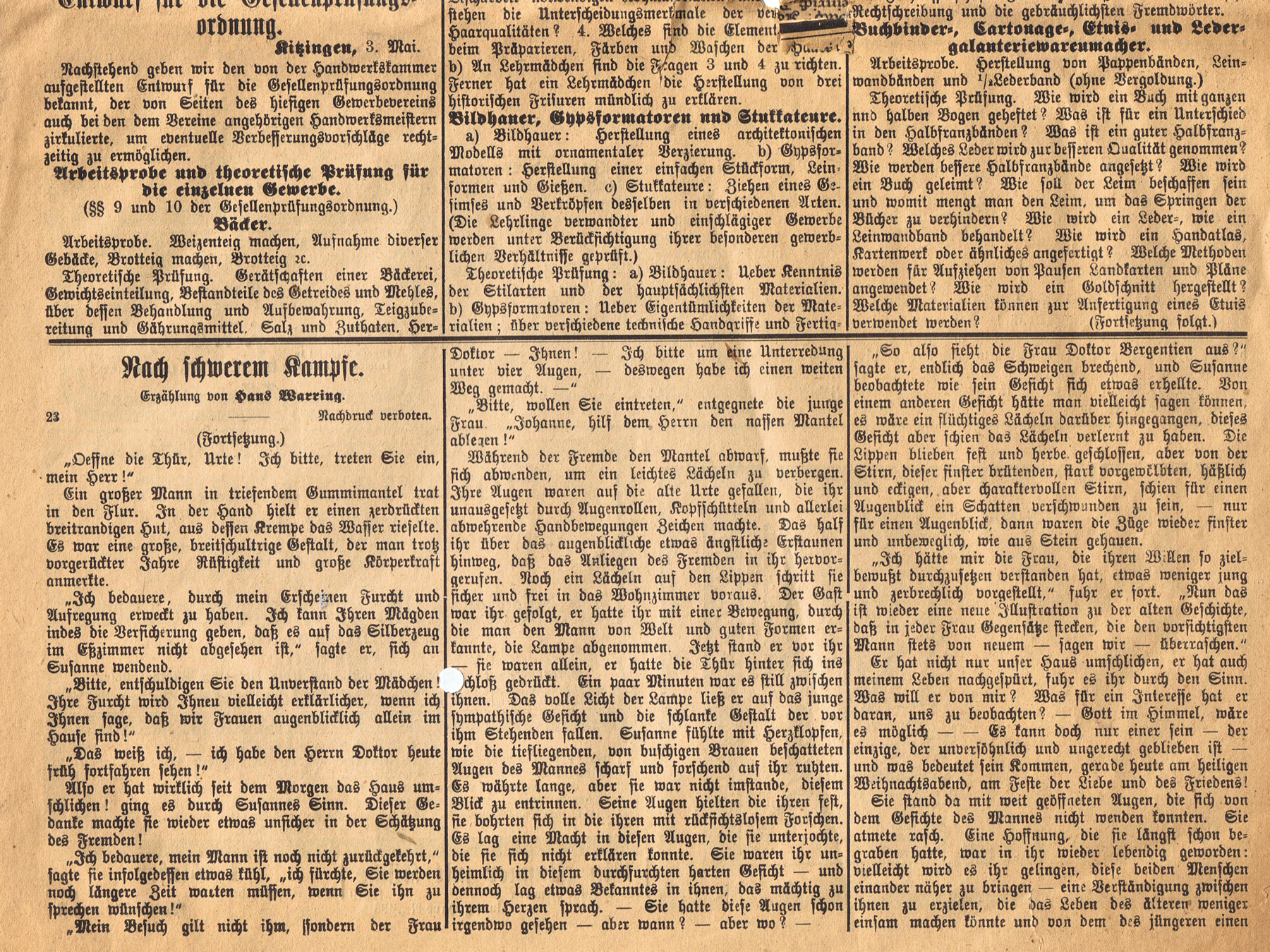 Mit öffentlicher Ausschreibung der Gesellenprüfungen für Bäcker, Barbier-,Friseur- und Perückenmacher, Brauer,Buchdrucker, Bildhauer, Gypsformatoren und Stukkateure sowei Buchbinder-, Cartonage-, Etuis- und Ledergalanteriewarenmacher