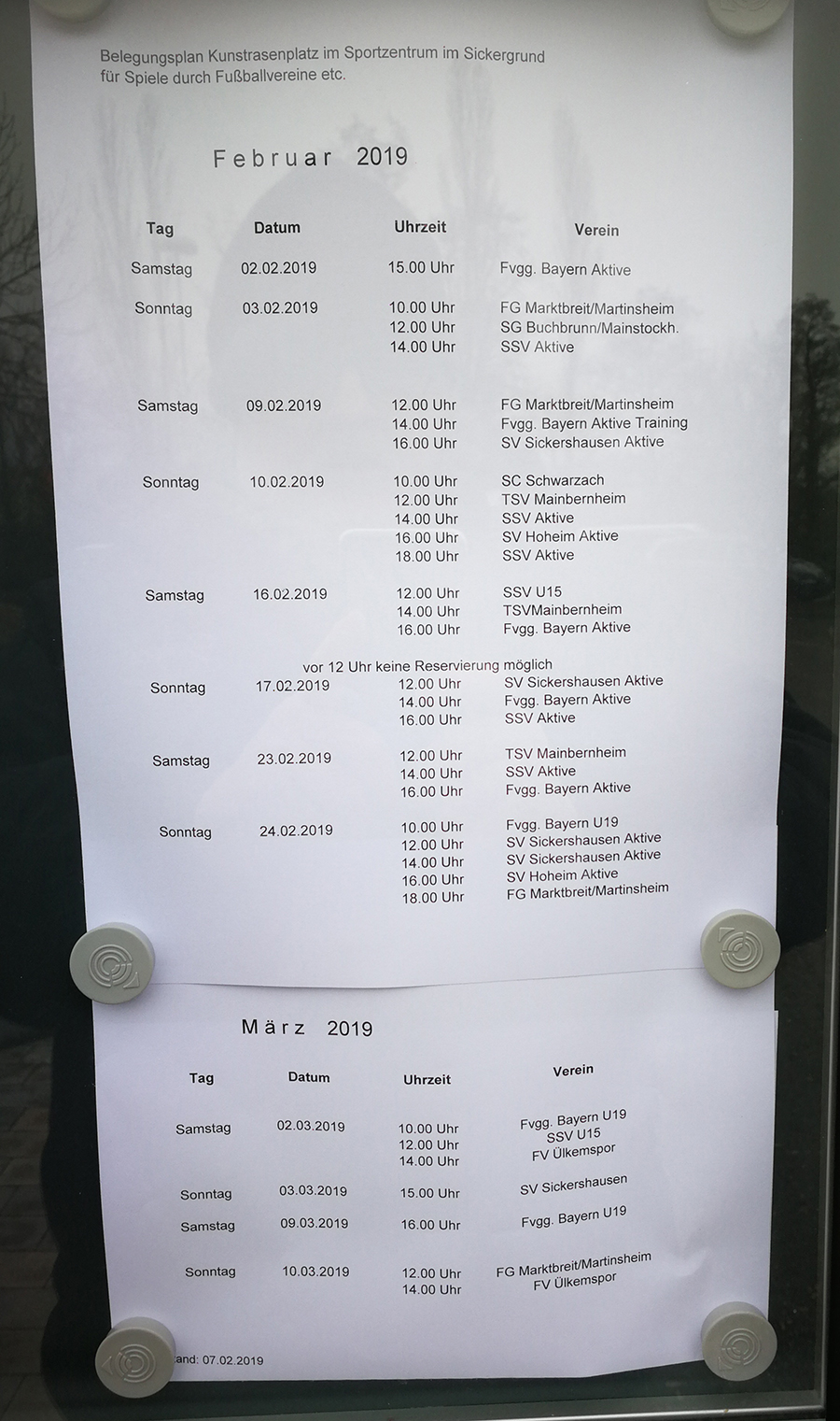 Belegungsplan Frühjahr 2019 Kunstrasenplatz Sickergrund Kitzingen