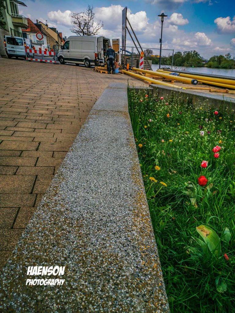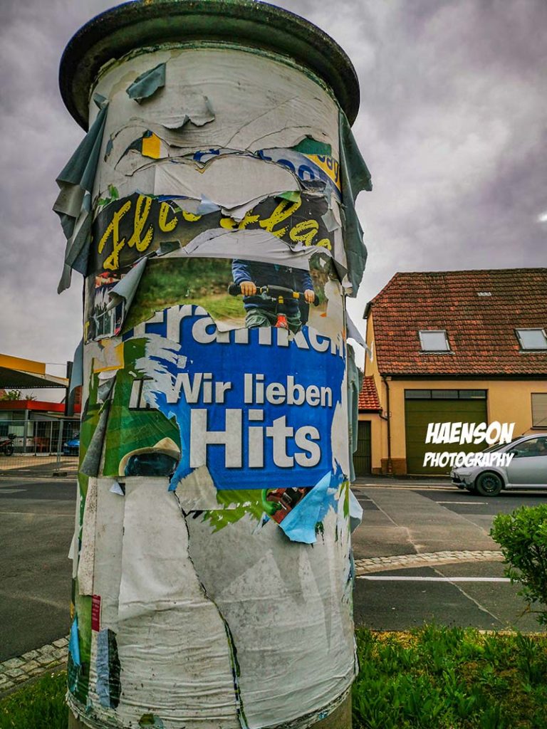 Aus- und Einblicke beim Walking. Abgefuckte Litfassäule, Blüten in Etwashausen, Kunst im Park, neues Schieferdach auf der Kreuzkapelle, Rohrverleger, Innenhof der Sauna. Hans Söllner im Ohr. Ein Lied aus dem Luftkurort Pieding in Bayern. Söllner singt über seine Edeltraud und die Wirkungen von Marijuana. 🙂