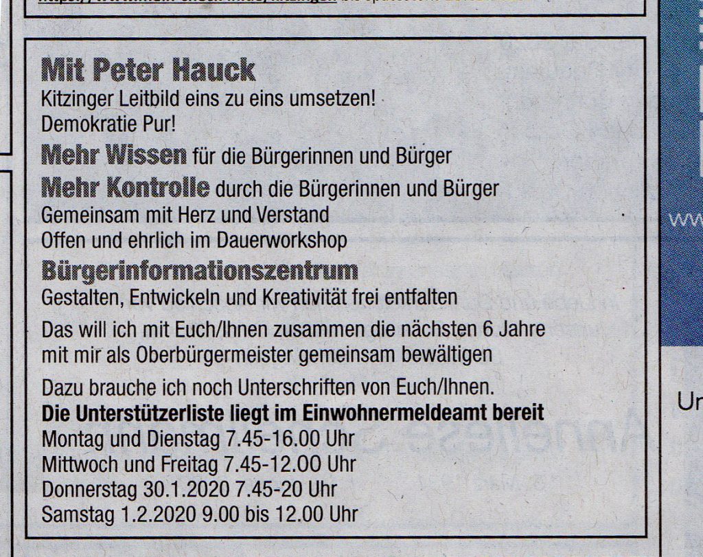 Peter Hauck will Oberbürgermeister werden. Zur Aufstellungsversammlung lädt er alle Kitzinger am Donnerstag, 9. Januar, um 18.30 Uhr in die Innopark-Gaststätte im Steigweg in Kitzingen ein. Neben Stefan Güntner (CSU), Manfred Paul (SPD), Uwe Pfeiffle (FW-FWB), Andrea Schmidt (Grüne) und Bianca Tröge (ÖDP) der sechste Kitzinger OB-Kandidat – und der einzige, der nicht als Parteimitglied, sondern unabhängig antritt. Ich kenne Peter seit dem Kindergarten und weiß das er es ernst meint.