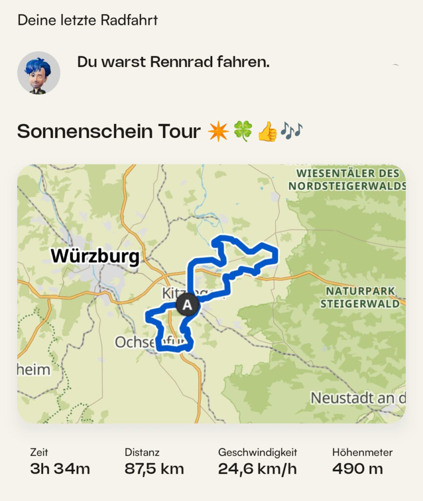 Das war heute eine Supertour, obwohl ein Bagger den Radweg zwischen Kitzingen und Mainstockheim blockierte. Gestern war der Blockierer ja ein LKW. Es ist immer was. So What. Ich mach heuer wieder bei Frostpendeln mit. Geht immer von 1. November bis 28. Februar. Heute nachfolgende Nachricht bekommen: „Du hast in 4 Fahrten 258,40km zurückgelegt und dabei 42,64kg CO2 vermieden.“